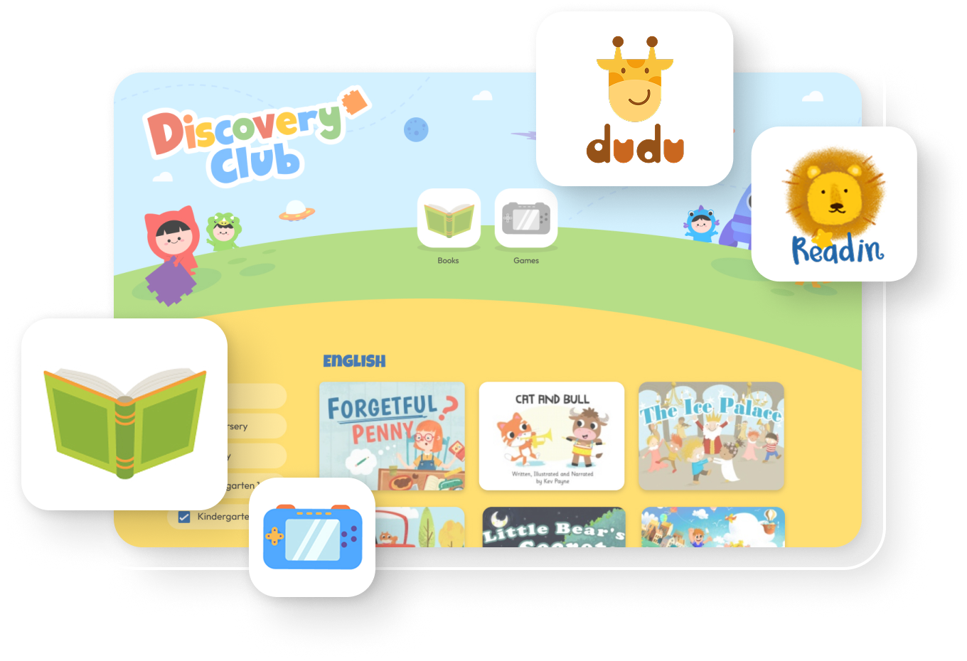 An interactive digital learning platform designed for preschool education. It features a curated library of interactive eBooks, customizable games, and engaging learning resources that help young children develop reading, listening, vocabulary, and pronunciation skills in a fun and safe environment. The platform is available in English and Chinese, with options to add Malay, Tamil, or other languages.